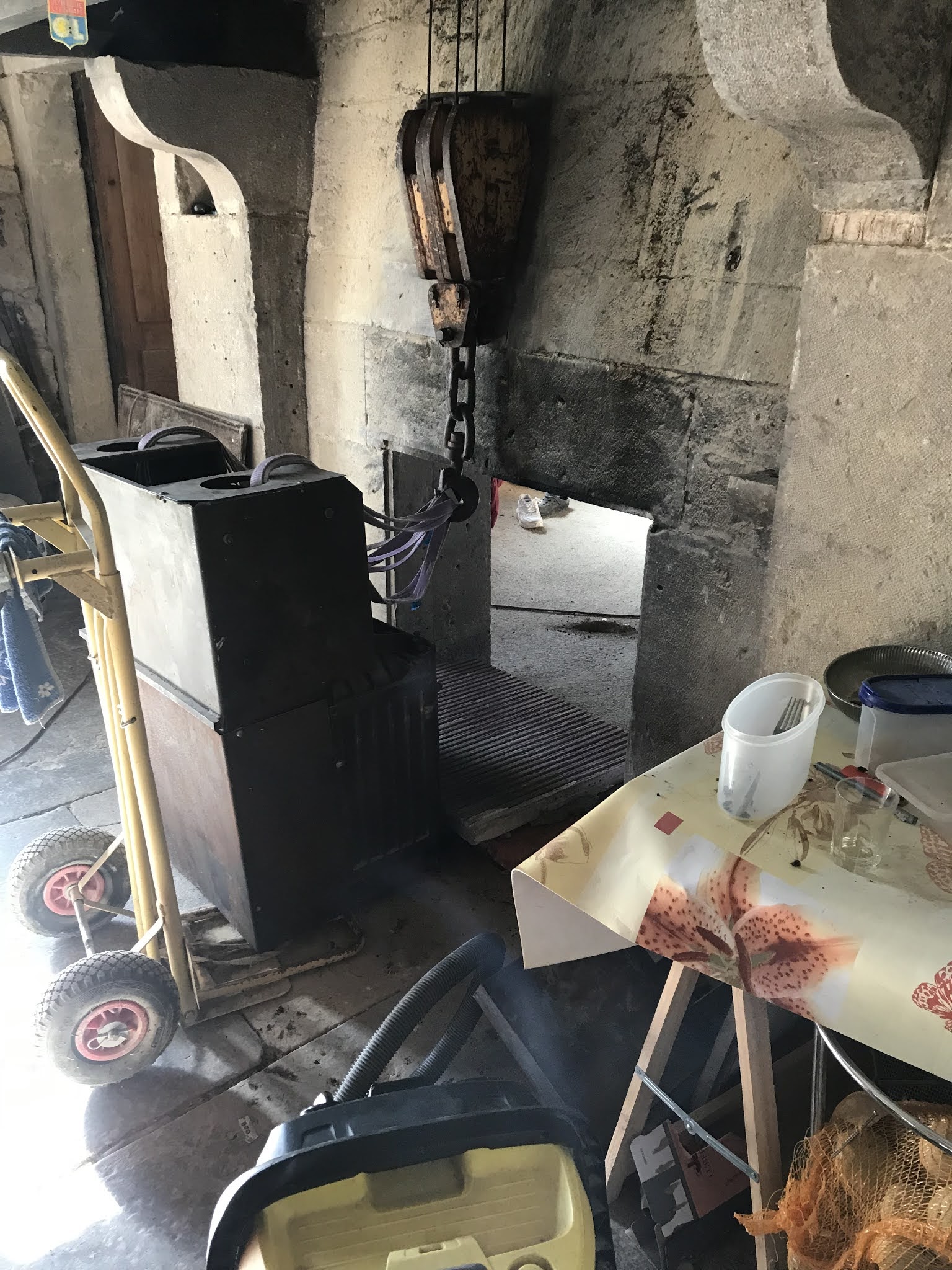 Rémy remet en état le mur laissé en pierres apparentes. Placard poncé, pierres nettoyées et frottées.